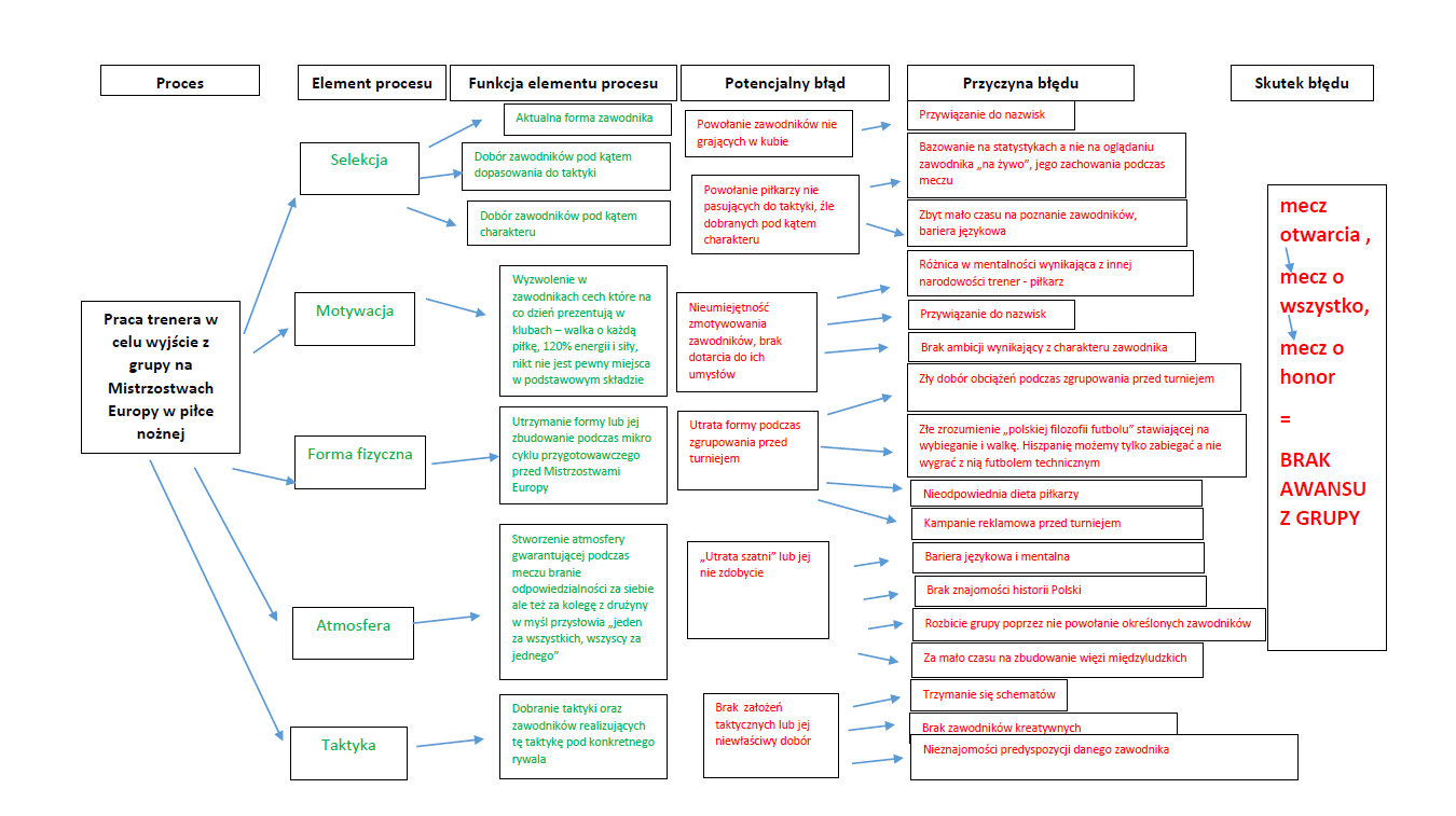 Obecnie dzięki AIAG & VDA oprócz tabelki wymagany jest dokładny opis Naszego procesu, który może być pokazany np. w formie “drzewa”. Ja takiego przykładowe drzewo zbudowałem dla trochę karkołomnego procesu a, że lubię sport i często do niego nawiązuję więc mój proces to “Praca trenera w celu wyjścia z grupy na Mistrzostwach Europy w piłce nożnej”